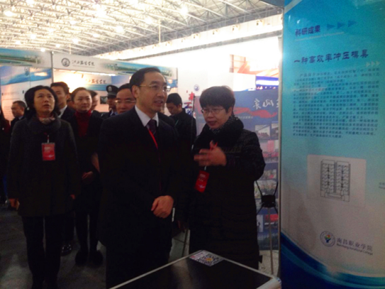 12月29—30日,省教育工委、省教育厅、省发改委、省工信委、省国资委、省科技厅、省科协、省工商联等在南昌国际展览中心主馆共同举办了“江西省首届高校科技成果对接会”,我院参加了本次“对接会”,并择优选送了学院近年来的9项科技成果和授权专利参会。30日上午省教育厅厅长叶仁荪、省教育副厅长喻晓社、郭奕珊等一行莅临我院展位,南昌职业学院科研处处长陈贵娣向他们介绍了我院的参展成果,叶厅长对我院机械工程系主任王高潮教授的“航空发动机高温合金高强度紧固件研制及其产业化开发”这一成果倍加关注并给予好评。我院将借本次会议的东风,加强我院的科技工作,为学院的内涵建设、促进教学工作注入活力,同时为加强校地合作、加强校企合作,促进高校科技成果转化和产业化,进一步提升高等教育服务区域经济社会发展能力。